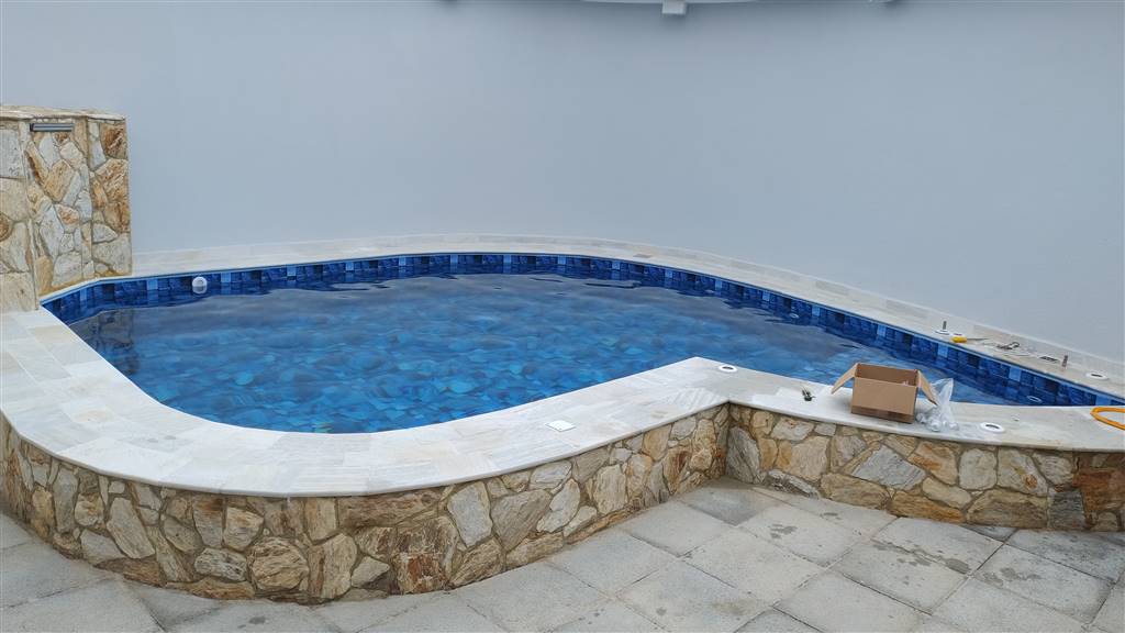 Área de lazer abrangendo metade da área do imóvel com Piscina com cascata, churrasqueira, chapa de aço, balcão com banquinhos deck Molhado integrado com o Espaço Gourmet com Churrasqueira Pia de granito e outro balcão com banquinhos. Salão grande com balcões de granito fechado com armários e uma mesa de madeira maciça e dois bancos grandes e dois pequenos, que acomoda mais ou menos dez pessoas. Pia de granito também com armários com portas de mogno. Salão de Festas ao lado do salão grande que atende a sauna, duchas e banheiro; mesas de madeira com quatro cadeira para cada mesa. Ao lado da cobertura que abrange a edícula que á casa principal, um banheiro que abrange o jardim. Essa rea coberta pode ser usada como salão de refeição.
