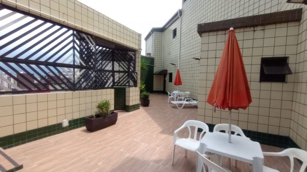 Área de lazer com salão de festas, jogos, e piscina no terraço.